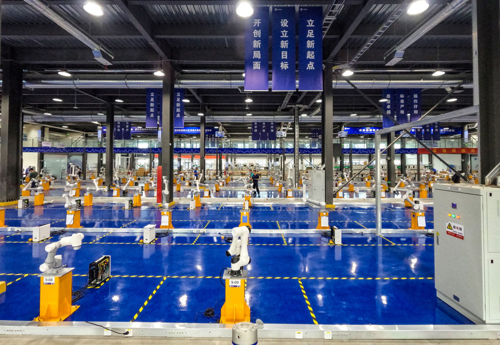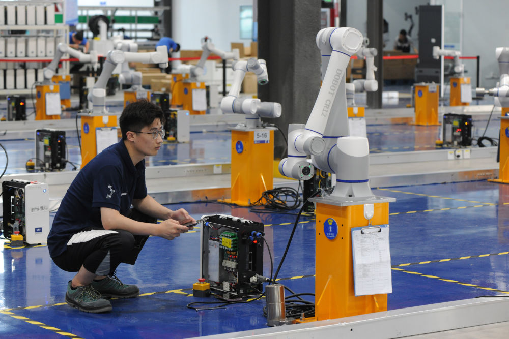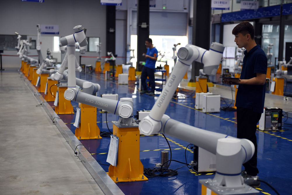 7月1日,山东省日照经济技术开发区越疆智能科技公司车间,工作人员正在调试轻量型机械臂产品。