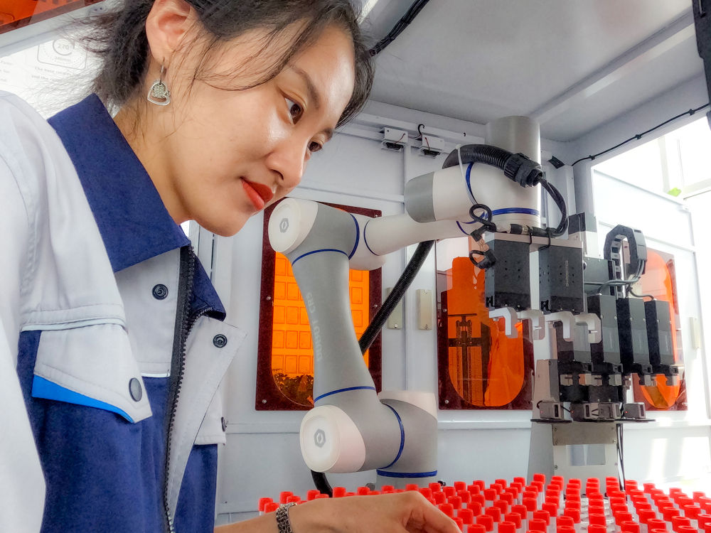 7月1日,在山东省日照市越疆智能科技有限公司,技术人员在测试核酸检测智能机械手。