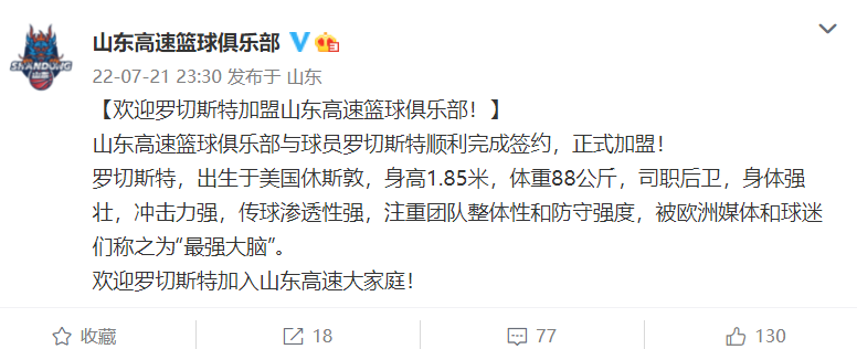 7月21日23时30分,CBA山东高速男篮官方宣布外援罗切斯特加盟,罗切斯特上赛季效力天津,表现出色,他也成为新赛季山东男篮正式签下的第一名新援。