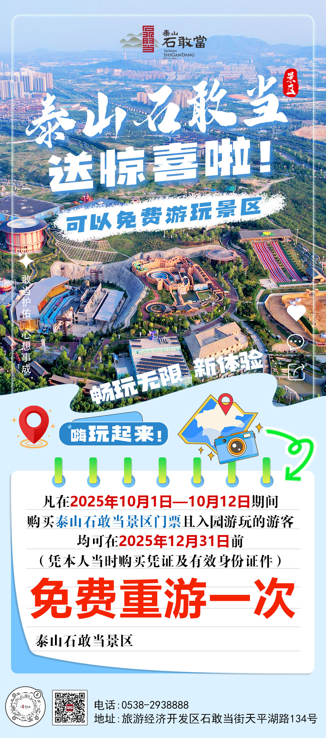 泰安日报社·中华泰山网讯(记者 毕凤玲 审核 晁彤彤)刚刚过去“双节”长假,秋雨淅沥,泰山石敢当景区也蒙上了一层朦胧的诗意,但也让一些游客的行程留下了些许遗憾。今天,记者从泰山石敢当景区了解到,为弥补这份秋日里的遗憾,景区特别推出“免费重游”暖心福利。凡在2025年10月1日—10月12日期间购买泰山石敢当景区门票且入园游玩的游客,均可在今年12月31日前(凭本人当时购买凭证及有效身份证件)免费重游一次。