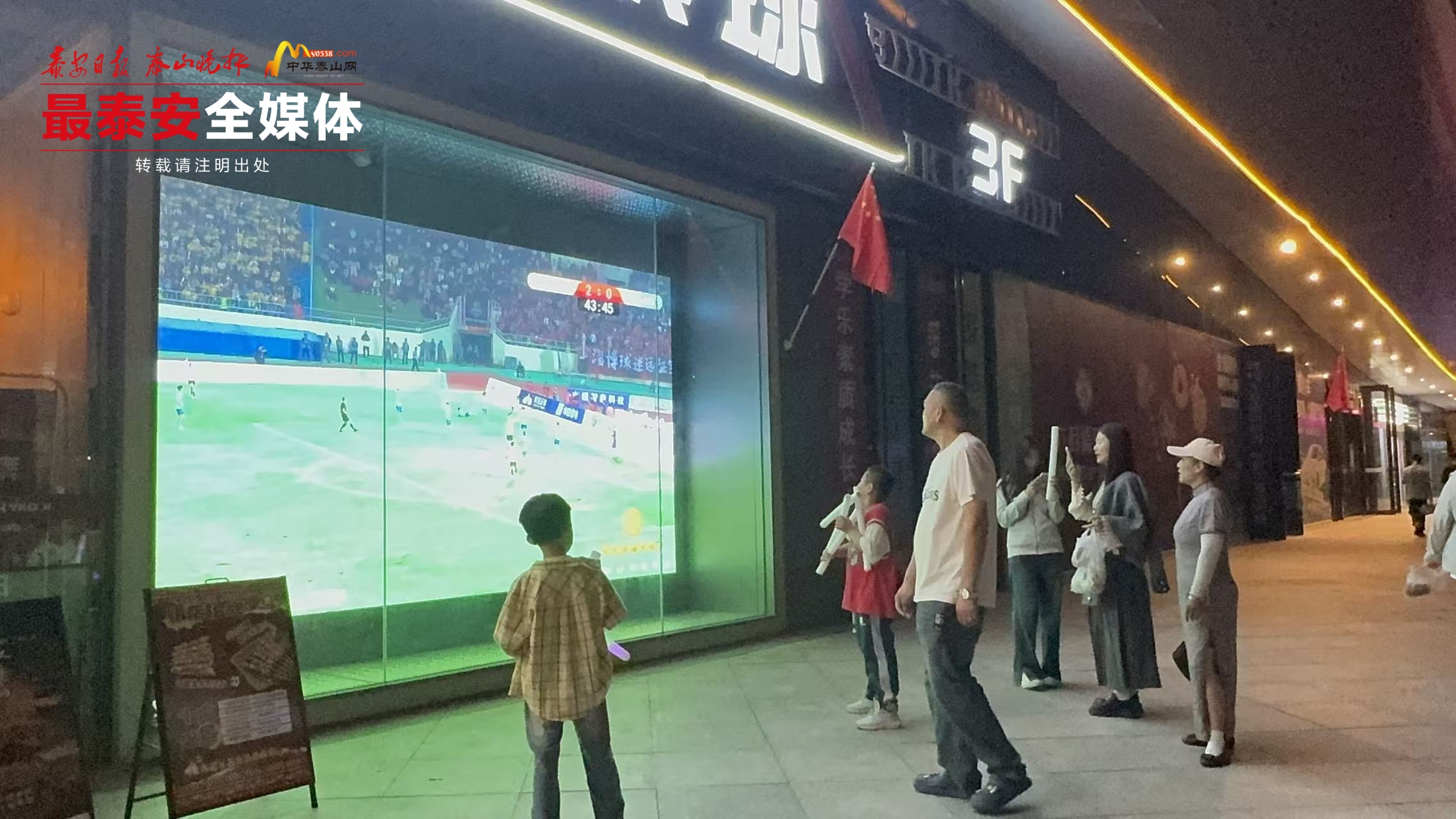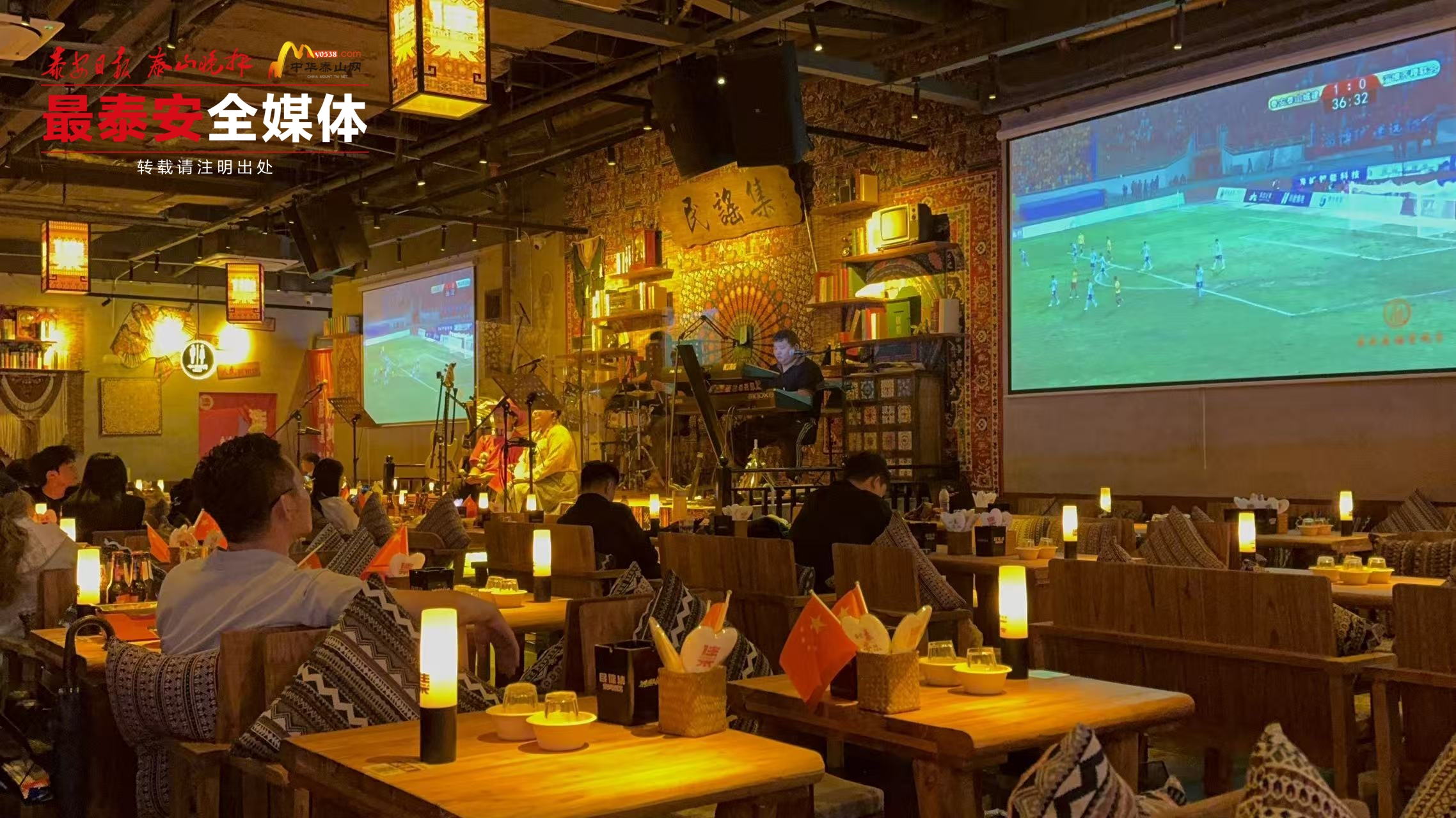 10月1日晚,在万达广场民谣集餐厅内,电视上播放着齐鲁超赛泰安主场迎战淄博队的实时画面,不少在餐厅用餐的市民边吃饭,边关注着电视内的赛况。在餐厅外的大屏幕上,实时的赛事画面也吸引了过往市民游客的目光,遇到精彩的画面,他们纷纷驻足观看。在这里,没有买到球票的球迷不仅可以来店里作为第二现场观看球赛,一起为泰安队加油,球迷还可以凭票根免费到店内领取两瓶啤酒。泰安民谣集负责人毕宏昇介绍,当晚赛事结束后,有身着观赛队服的球迷走入餐厅,为泰安队取得的胜利庆祝。