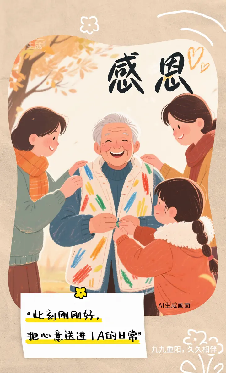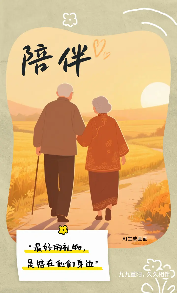 岁岁重阳,今又重阳。当菊香弥漫秋日,我们迎来了这满载温情的九九佳节。每一幅画面,每一句低语,都在诉说着我们与长辈之间的故事。在这个重阳,让我们把这些情感酿成行动,或是一次陪伴,或是一句问候,让久久相伴的暖意,在这个秋天,在彼此心间,温柔绽放。