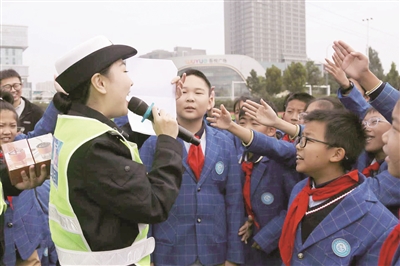活动中,宣传人员通过互动的方式,让学生感受交通出行关乎生命安全的重要意义,并号召学生不仅要做交通参与者,还要做交通倡议者,以“小手拉大手”的方式带动身边更多人加入“文明交通、携手共创”队伍,提升“知危险、会避险”的自我保护能力。